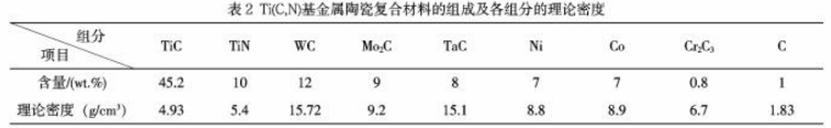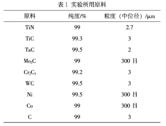 金屬陶瓷(cermet)是由一種或幾種金屬組分與陶瓷材料經(jīng)過(guò)復(fù)合而成的一種非均質(zhì)材料,其中,陶瓷組分約占15~85 vol%。Ti(C,N)基金屬陶瓷復(fù)合材料出現(xiàn)于20世紀(jì)70年代,由于其具有硬度高,較理想的高溫性能和耐磨性,較好的化學(xué)穩(wěn)定性,以及較高的抗月牙洼磨損能力與抗氧化能力等性能優(yōu)點(diǎn),因而廣泛應(yīng)用于切削刀具、耐磨材料等領(lǐng)域。地殼中Ti資源含量豐富,成為可代替稀缺資源WC基硬質(zhì)合金材料的候選材料之一,因此近年來(lái)Ti(C,N)基金屬陶瓷復(fù)合材料成為熱門研究方向。Ti(C,N)基金屬陶瓷材料以Ti(C,N)為基礎(chǔ)硬質(zhì)相(添加方式主要是直接添加Ti(C,N)或者添加TiC與TiN再合成Ti(C,N),后者具有經(jīng)濟(jì)優(yōu)勢(shì)),采用Ni、Co或(和)Mo等金屬或合金為粘結(jié)相,根據(jù)工況添加其他一些難熔的氮化物或碳化物(如SiN?、AIN、WC、MoC、VC等)為增強(qiáng)相而制成的一種復(fù)合材料。本實(shí)驗(yàn)以TC和TiN為基礎(chǔ)原料合成Ti(C,N),添加碳化物WC、MoC、CrCa、TaC作為補(bǔ)強(qiáng)相,以Ni和Co為復(fù)合金屬粘結(jié)相,通過(guò)熱壓燒結(jié)工藝制備了Ti(C,N)基金屬陶瓷復(fù)合材料。