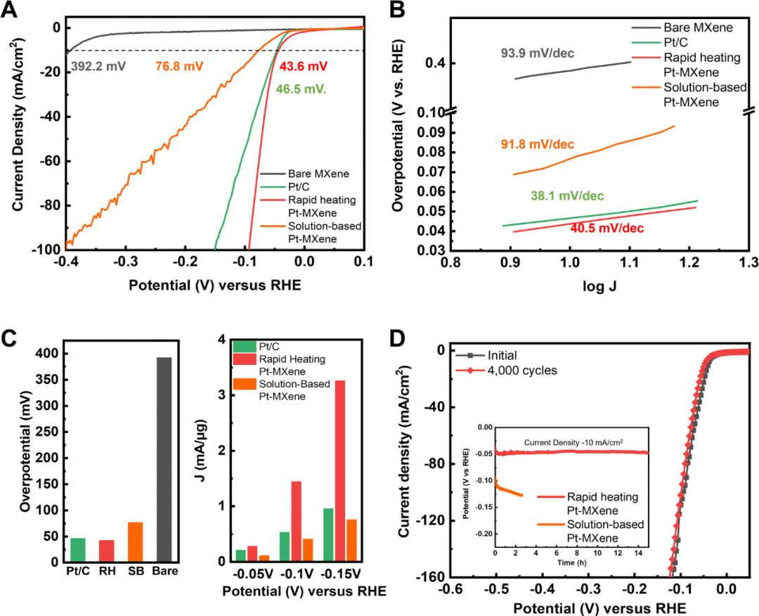 圖3 展示了快速加熱Pt-MXene作為電催化劑在HER中的性能。快速加熱Pt-MXene表現(xiàn)出低過(guò)電位和高催化活性,與商業(yè)Pt/C相比具有更高的質(zhì)量活性和更低的Tafel斜率。這歸因于Pt納米顆粒的均勻分布和MXene表面在合成過(guò)程中的保護(hù),從而最大化了催化活性位點(diǎn)的暴露。此外,快速加熱Pt-MXene在長(zhǎng)期穩(wěn)定性測(cè)試中顯示出優(yōu)異的穩(wěn)定性,遠(yuǎn)超過(guò)溶液處理的Pt-MXene。