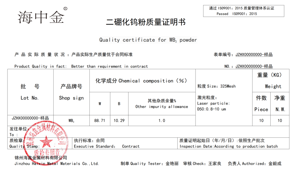 產(chǎn)品名稱:二硼化鎢(WB2) 規(guī)格:0.8-10um(D50)   形貌:不規(guī)則 顏色:黑灰色  特點:高硬度,高韌性,耐磨損,耐高溫,耐腐蝕,良好的化學(xué)穩(wěn)定性和導(dǎo)電性,及對中子有優(yōu)異的吸收效果 用途:切削刀具、‌耐磨涂層以及半導(dǎo)體薄膜等領(lǐng)域