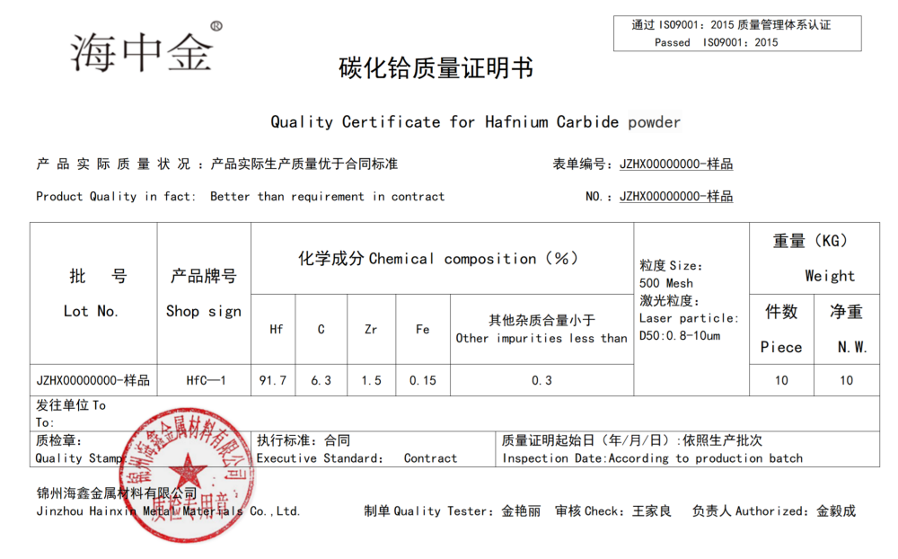 5、HfC碳化鉿粉末材料由于高熔點,作為添加劑應(yīng)用在煉鋼工業(yè)中作脫氧劑,可以大幅度提高鋼材質(zhì)量。