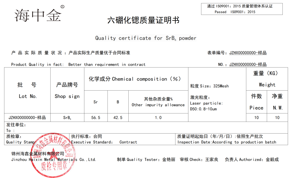 性質(zhì):六硼化鍶(SrB6)室溫下為黑色晶狀粉末,非常穩(wěn)定,熔點(diǎn)高,密度大。